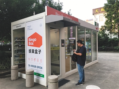 这是一家名为缤果盒子的无人便利店,在距离它身旁的写字楼,入驻着多家互联网公司,这里的上班族们,走出楼门数步即可购物。